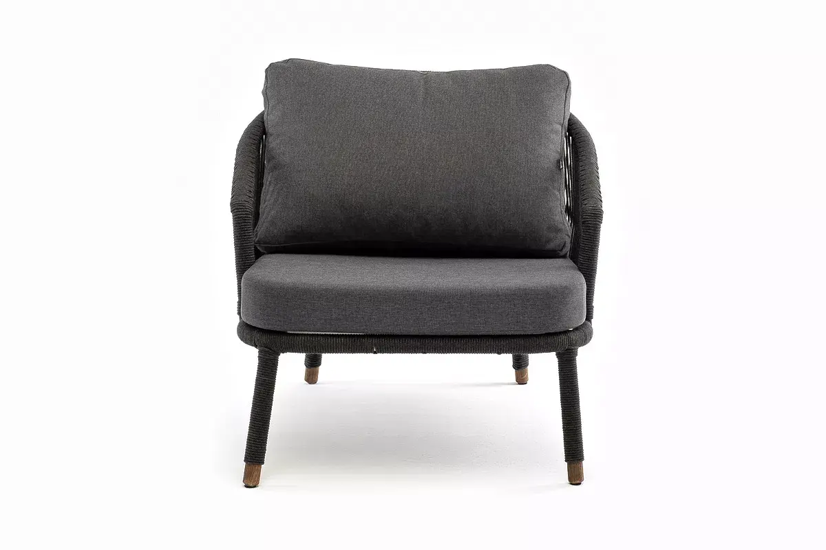 Кресло имеет алюминиевый каркас, окрашенный порошковой краской в темно-серый (RAL7024) цвет. Боковины каркаса вручную оплетены роупом - эластичными синтетическими лентами, изготовленными из высокопрочных полиэфирных волокон. Цвет оплетки - темно-серый. На ножках кресла идут дубовые наконечники (заглушки).