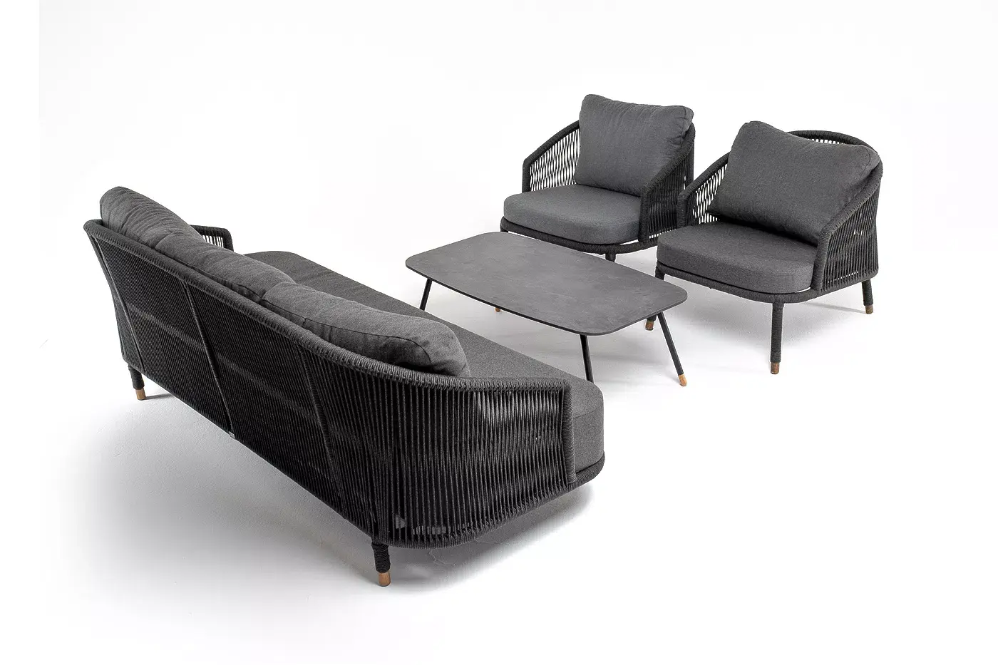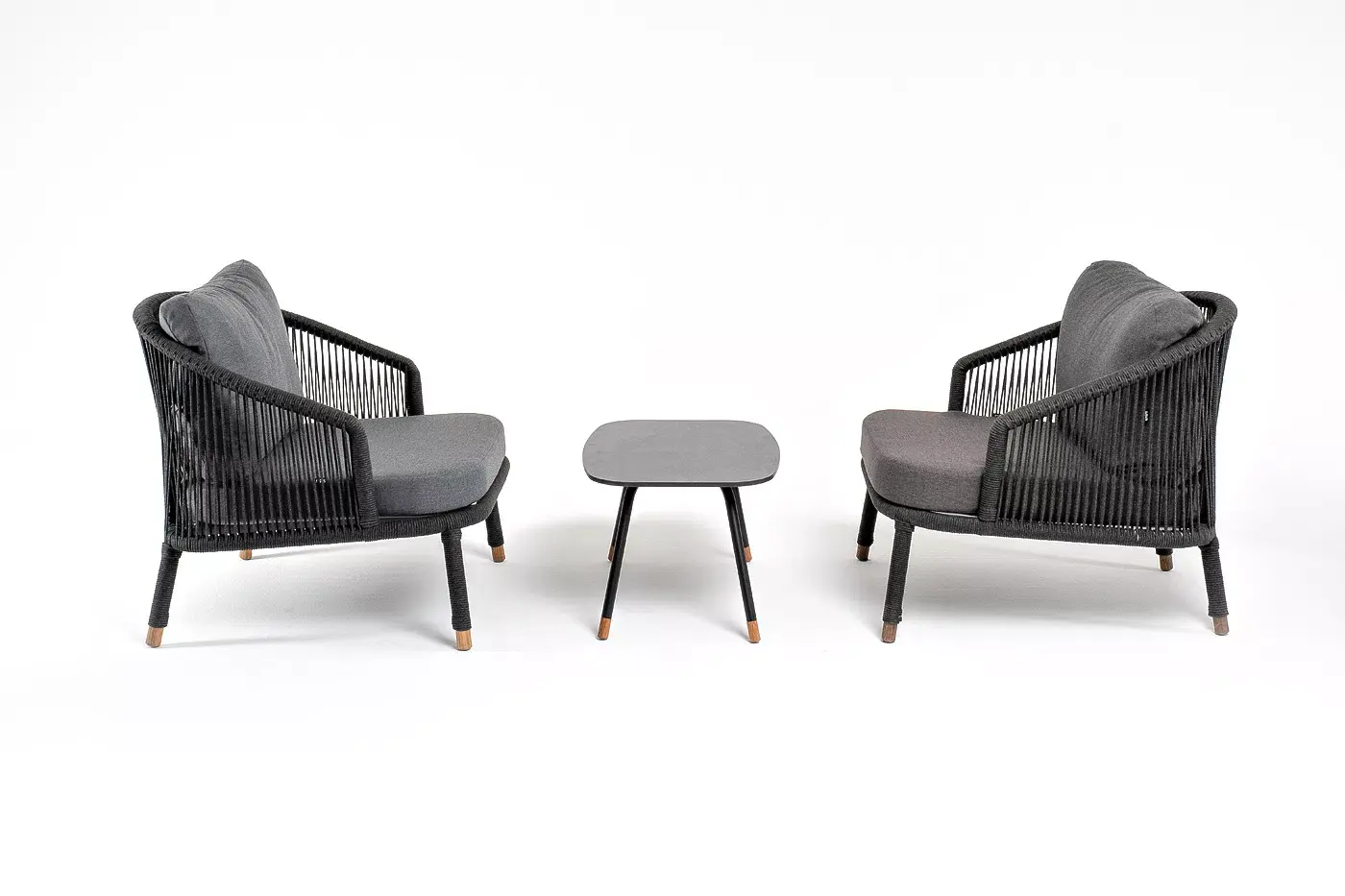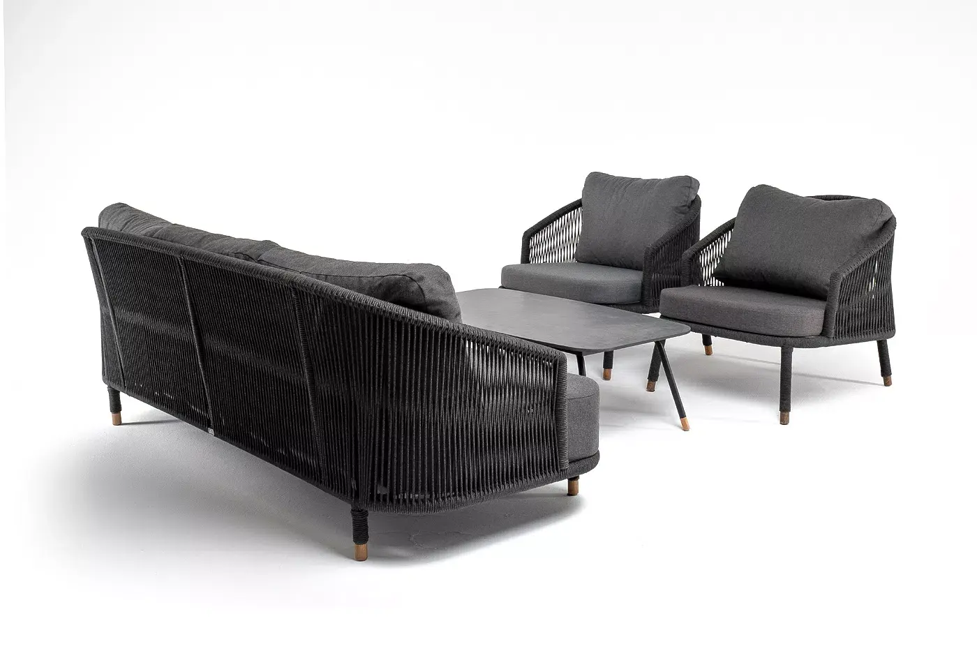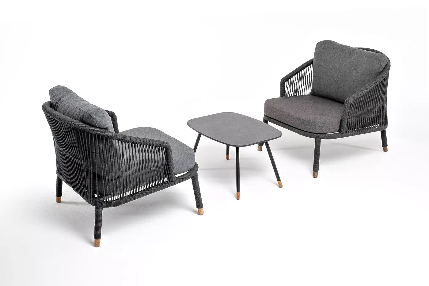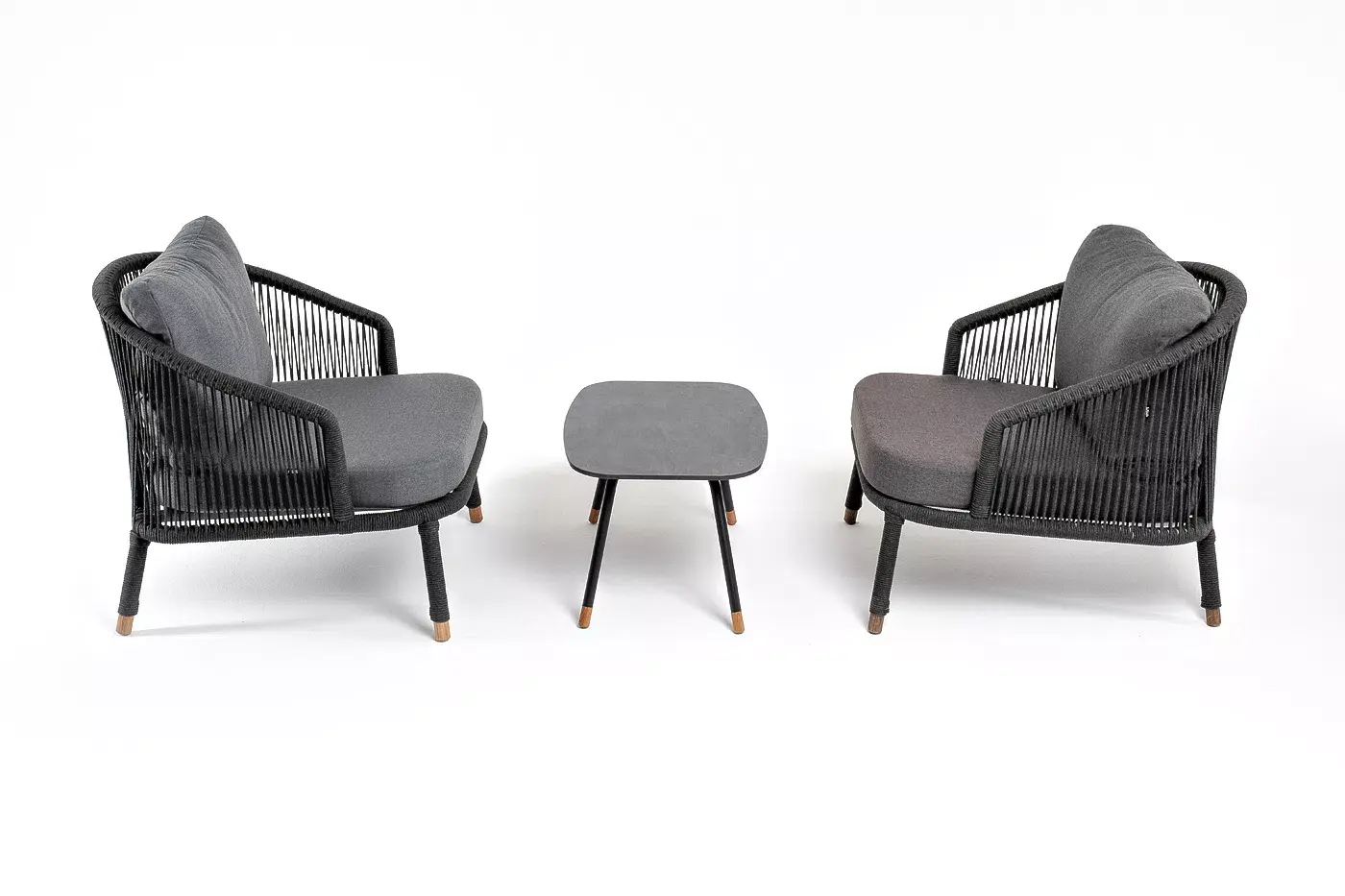 Каркас уличной мебели выполнен из износостойкого алюминия. Его дополняет темно-серая ручная оплетка, изготовленная на основе эластичных синтетических лент из полиэфирных волокон высокой прочности (роупа).