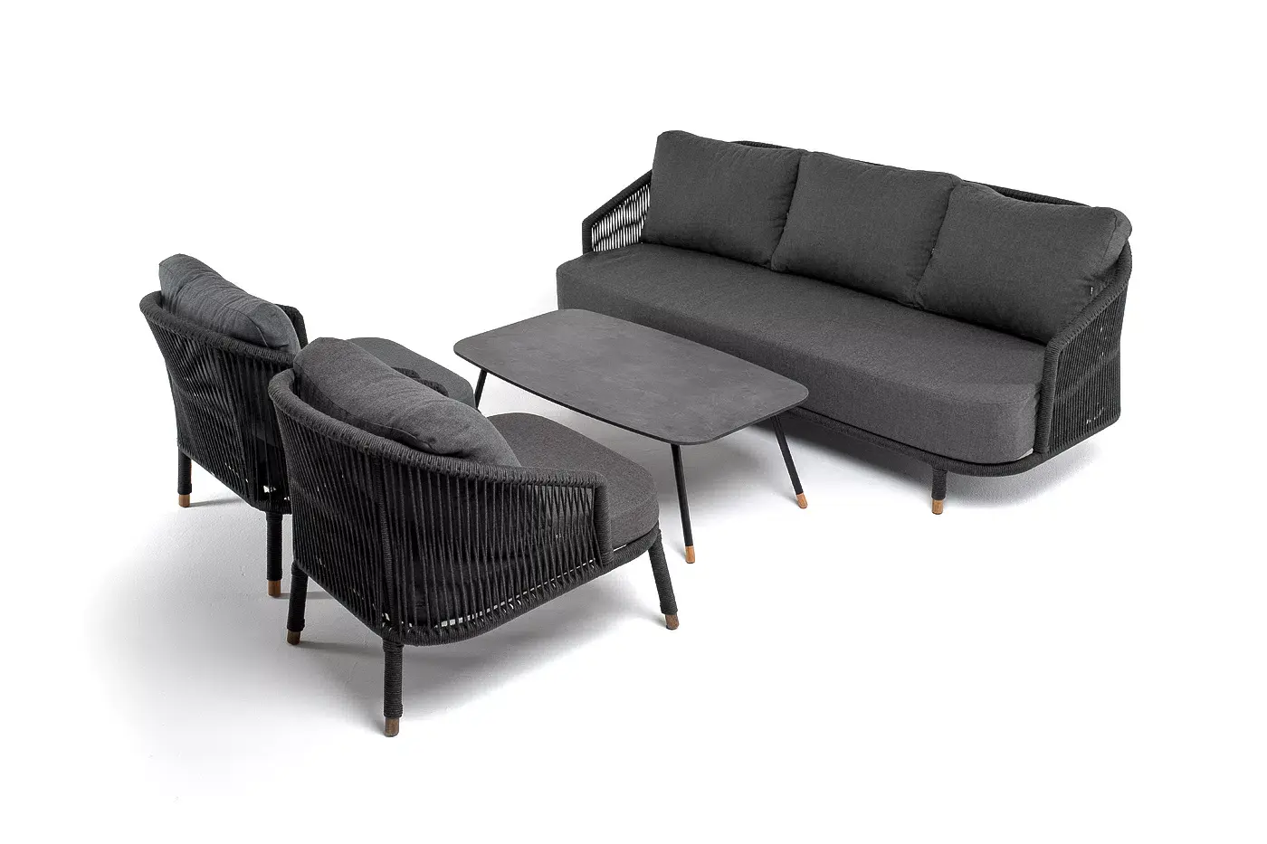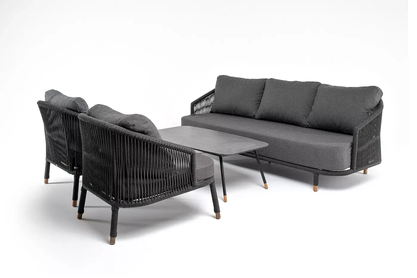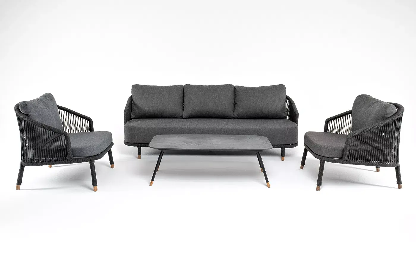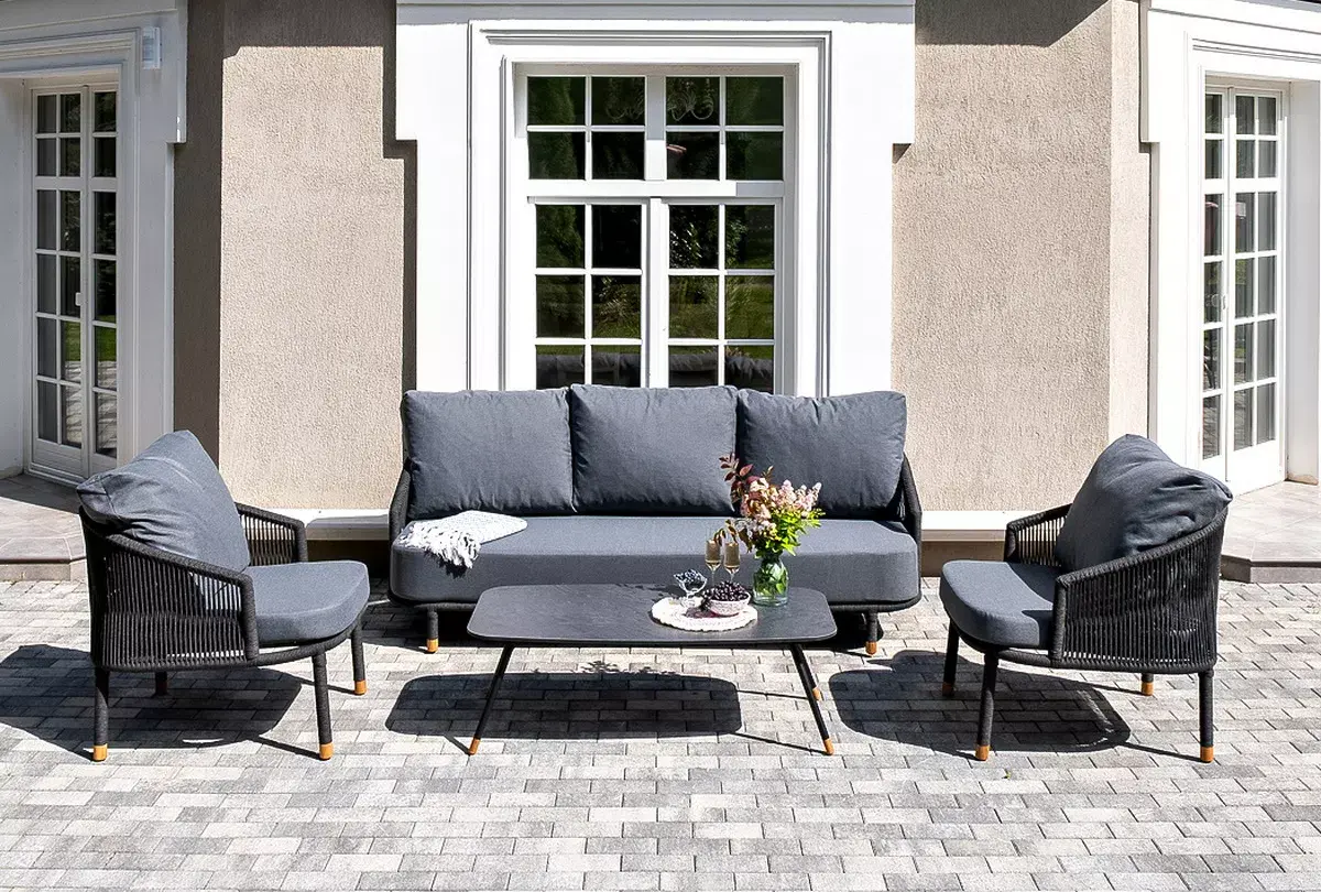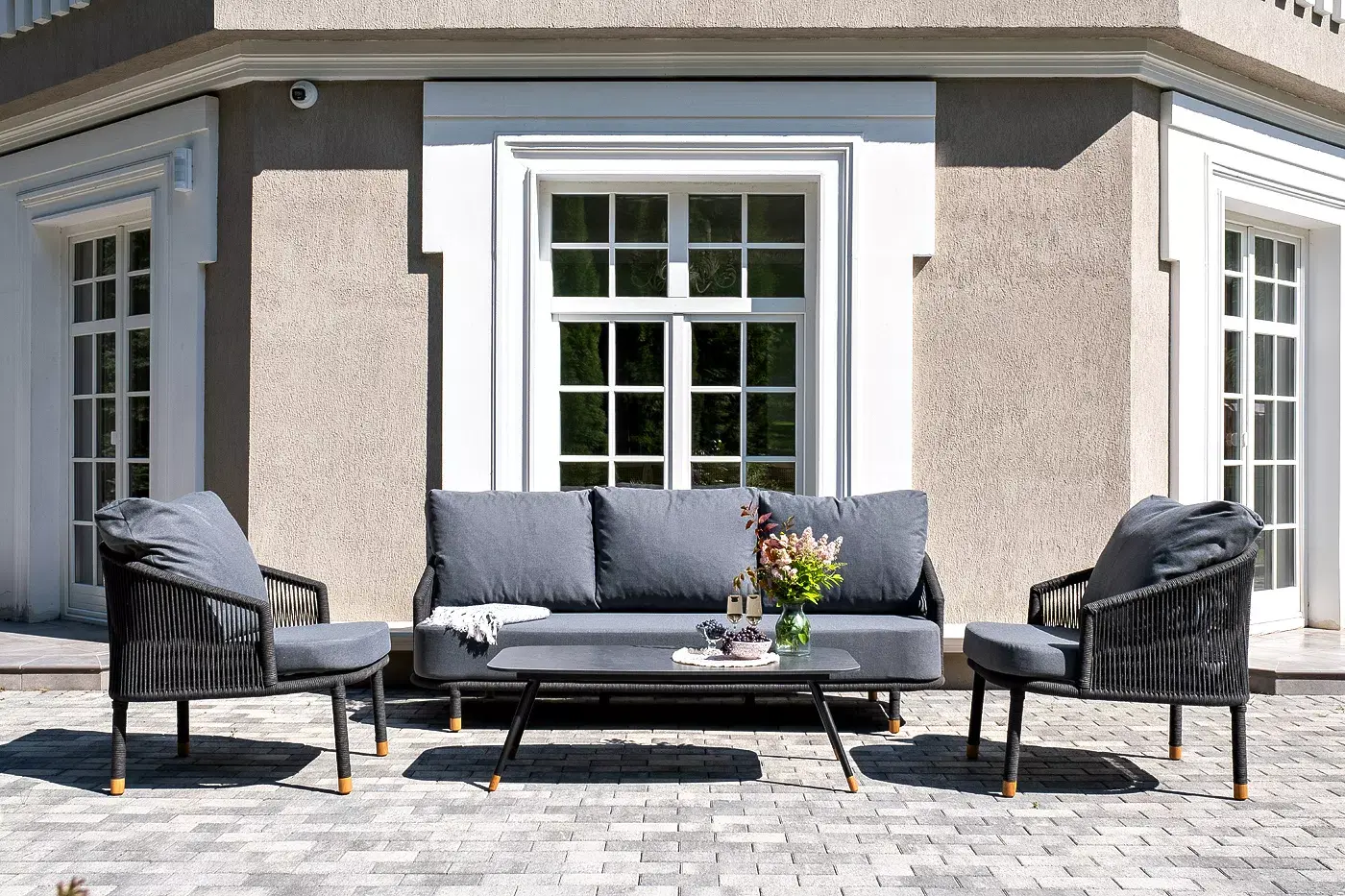 Каркас уличной мебели выполнен из износостойкого алюминия. Его дополняет темно-серая ручная оплетка, изготовленная на основе эластичных синтетических лент из полиэфирных волокон высокой прочности (роупа).