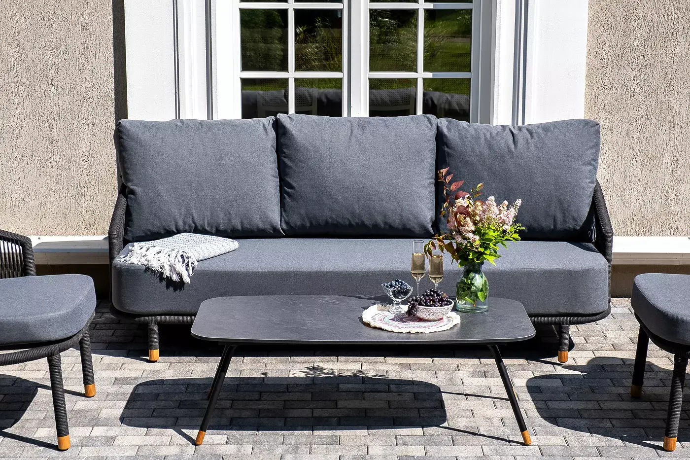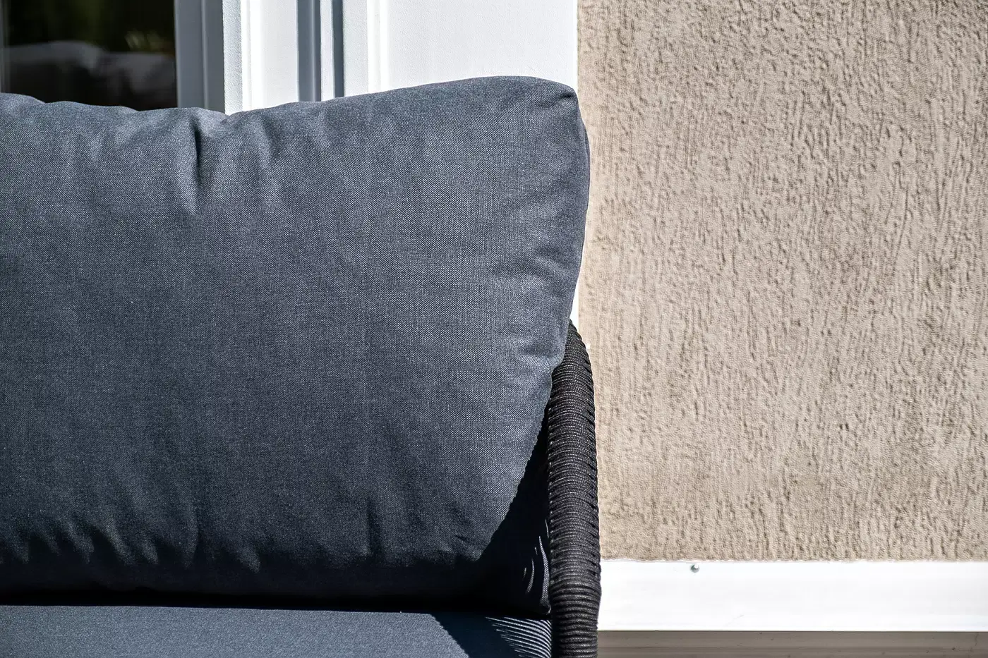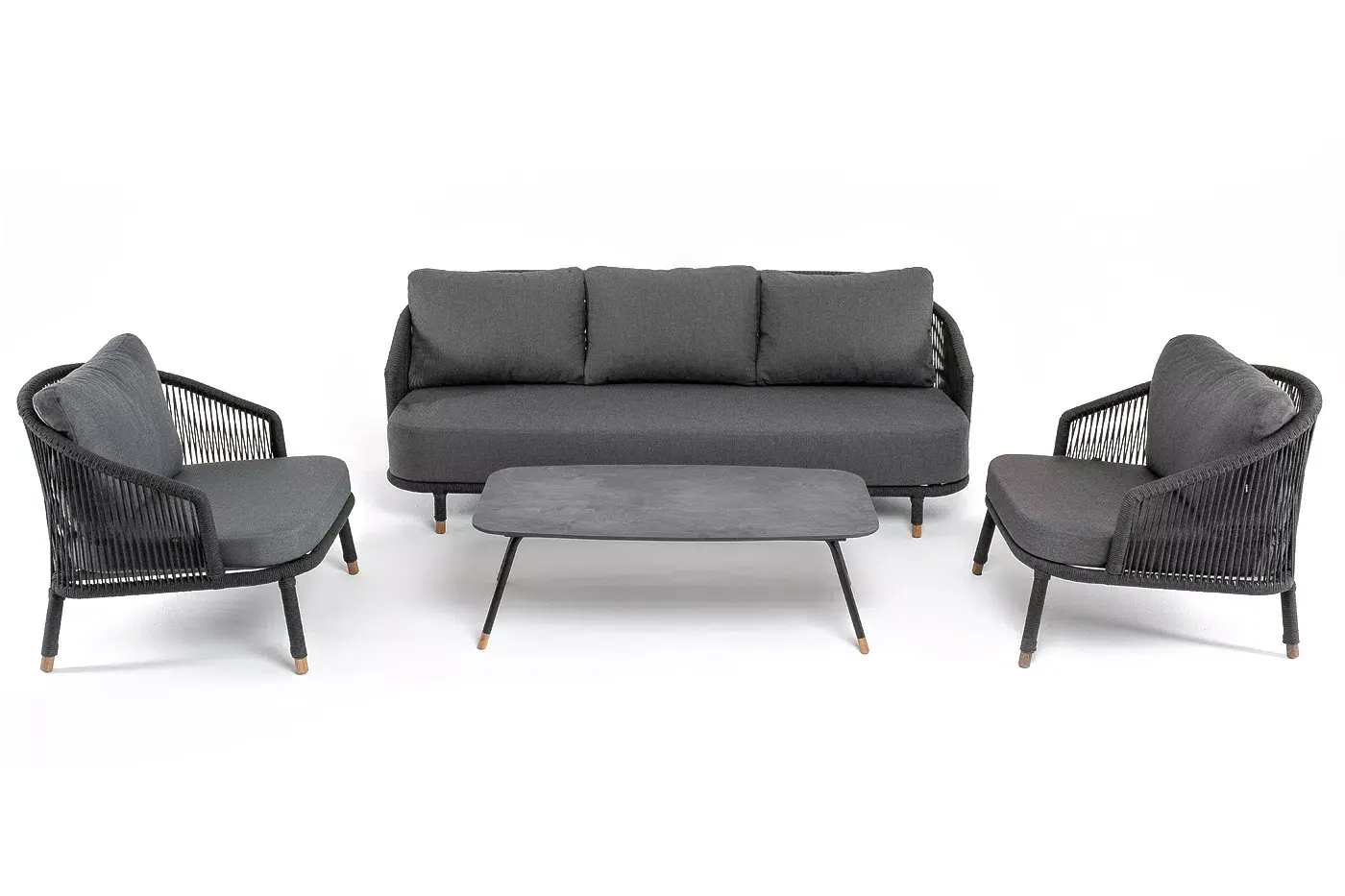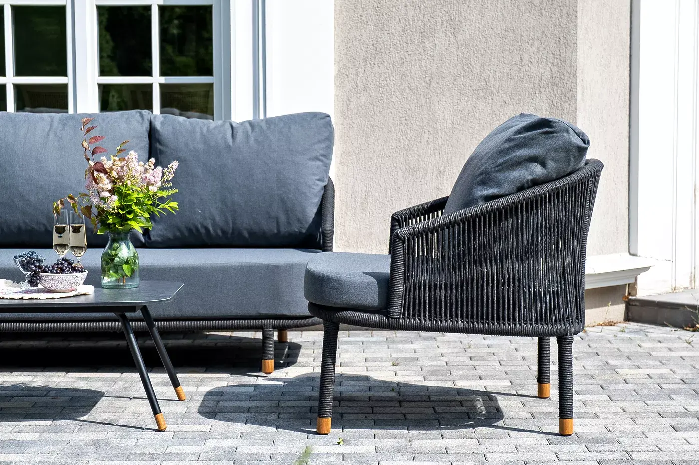 Каркас уличной мебели выполнен из износостойкого алюминия. Его дополняет темно-серая ручная оплетка, изготовленная на основе эластичных синтетических лент из полиэфирных волокон высокой прочности (роупа).