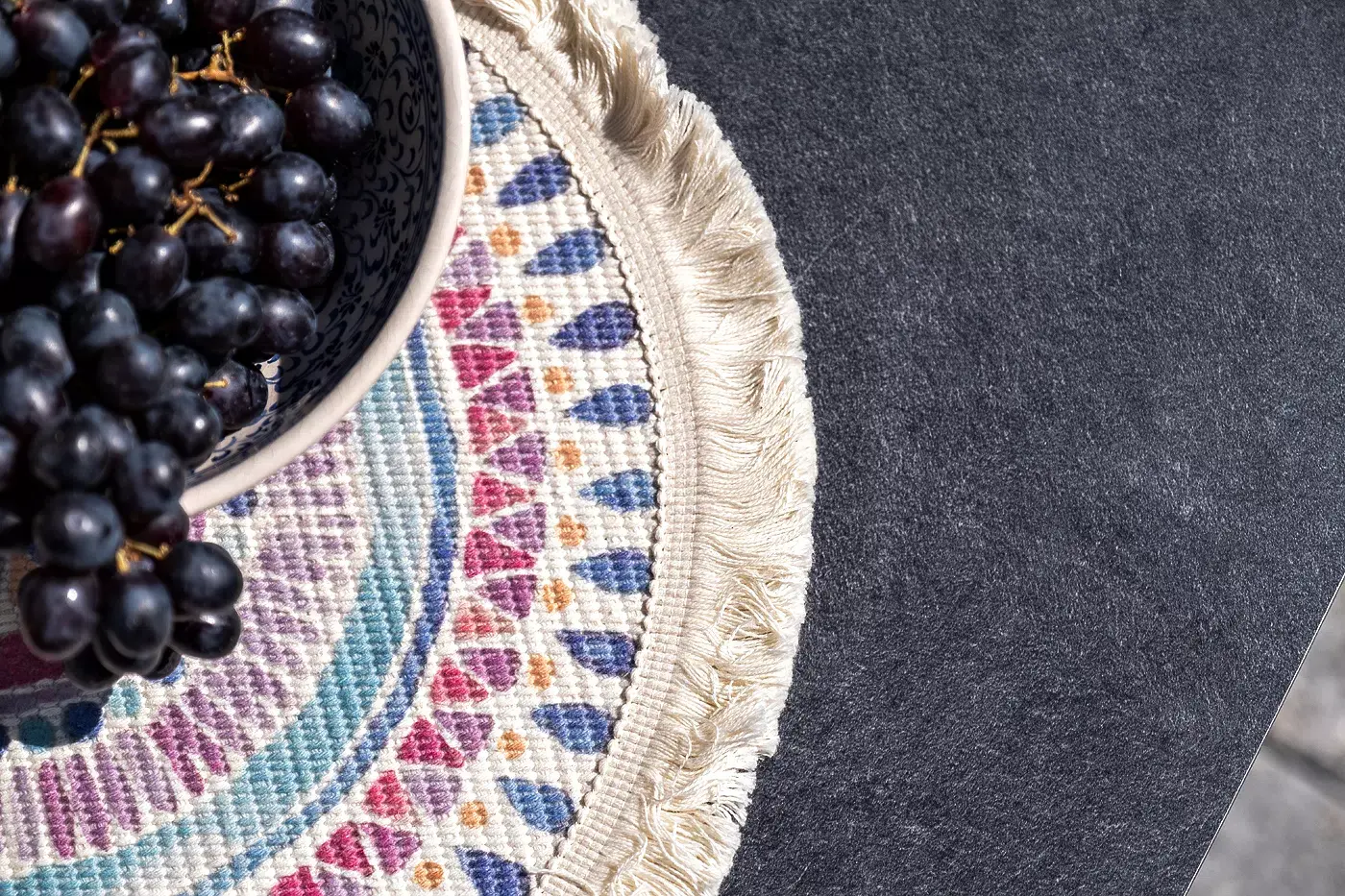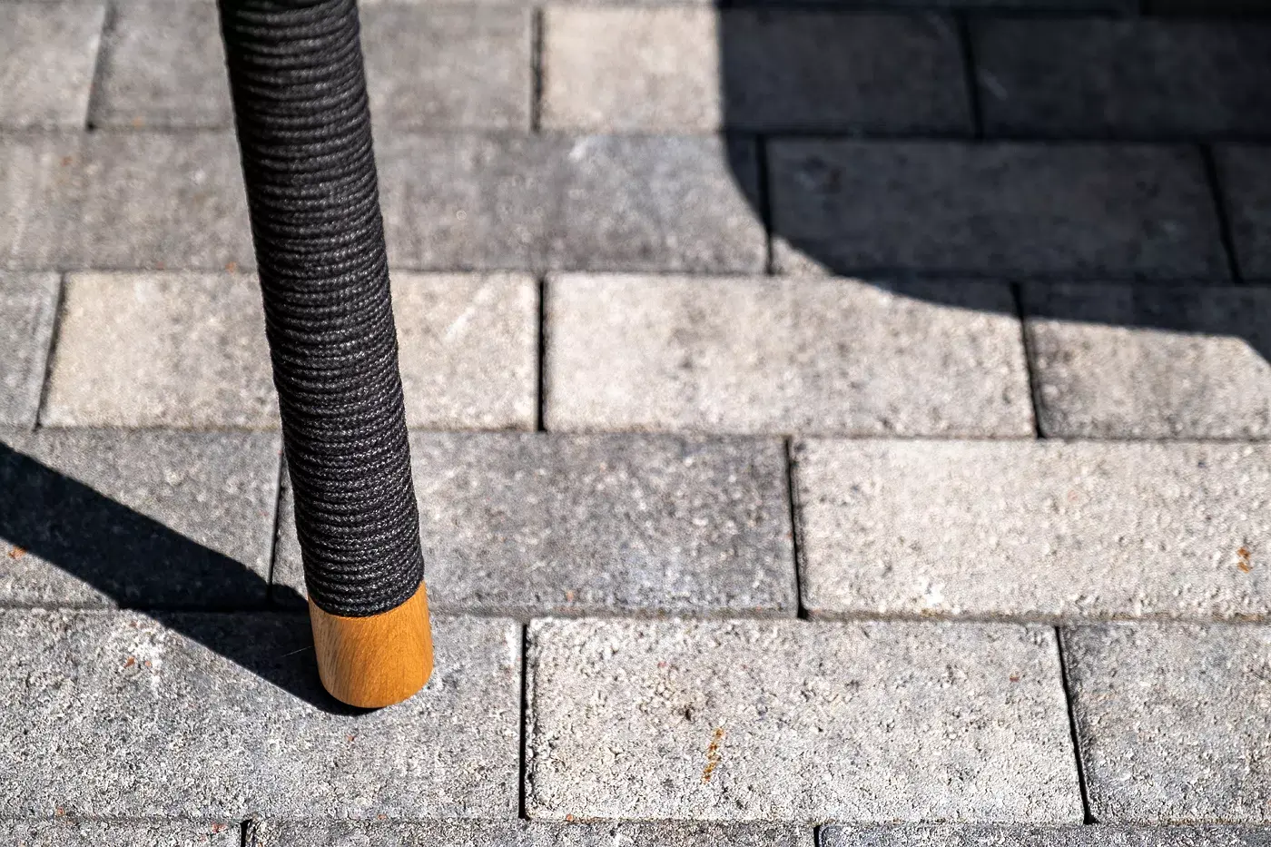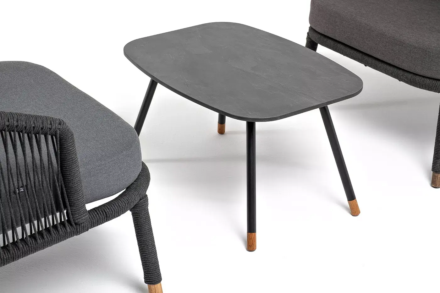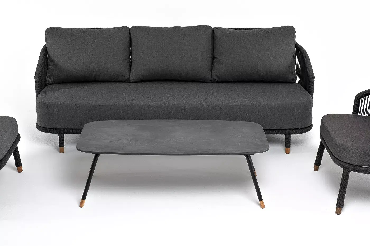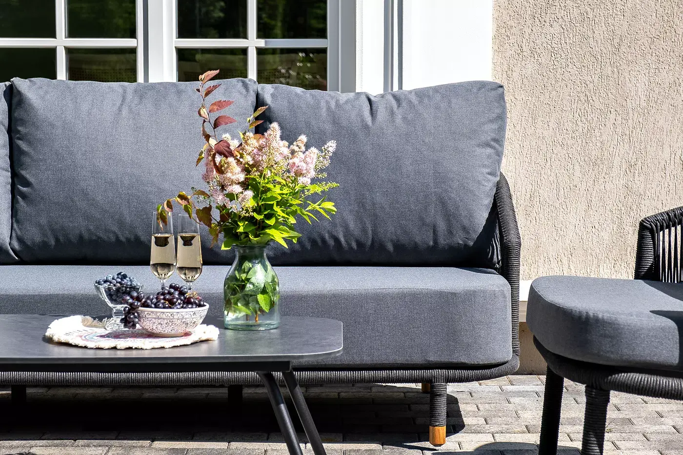 Каркас уличной мебели выполнен из износостойкого алюминия. Его дополняет темно-серая ручная оплетка, изготовленная на основе эластичных синтетических лент из полиэфирных волокон высокой прочности (роупа).