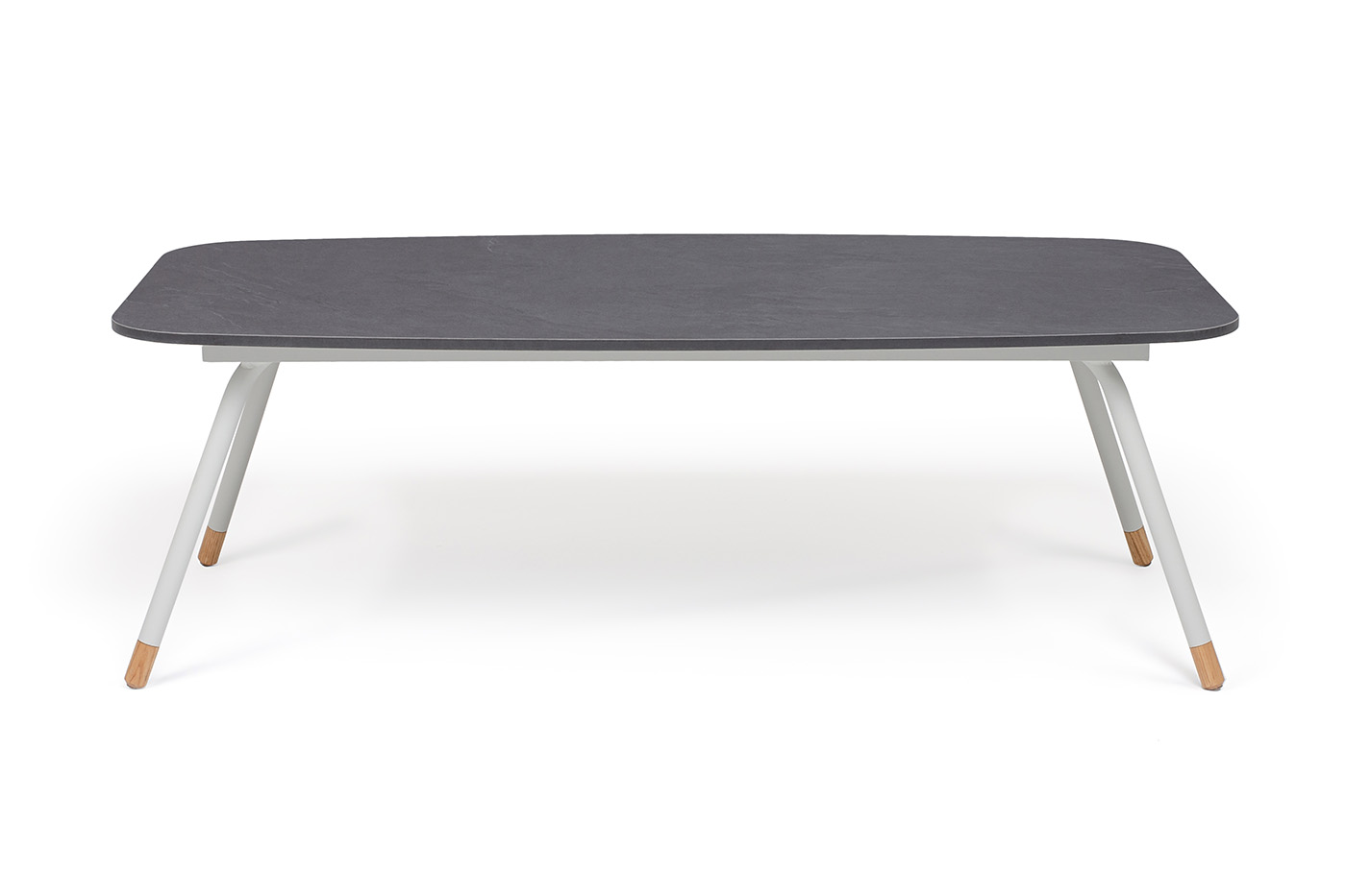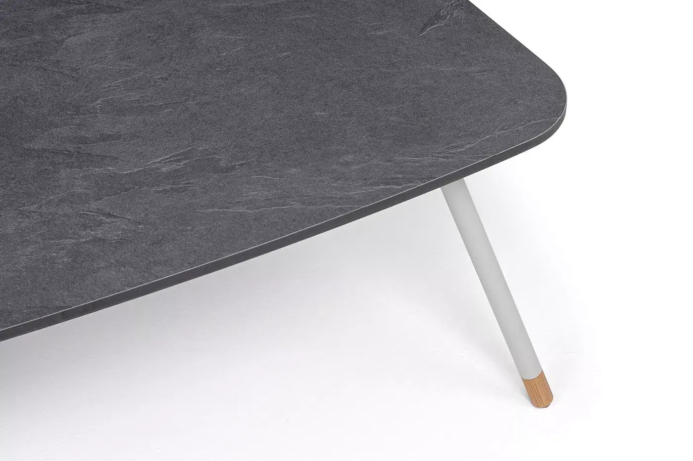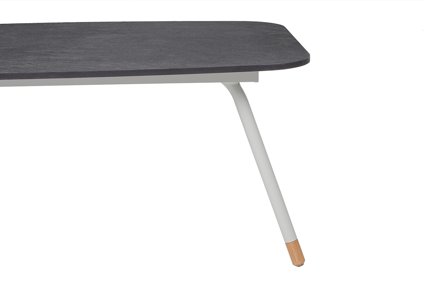 Каркас столика изготовлен из алюминия, окрашенного в светло-серый цвет. Алюминий является легким и прочным материалом, что обеспечивает долговечность и надежность изделия. На ножках столика идут дубовые наконечники (заглушки).
