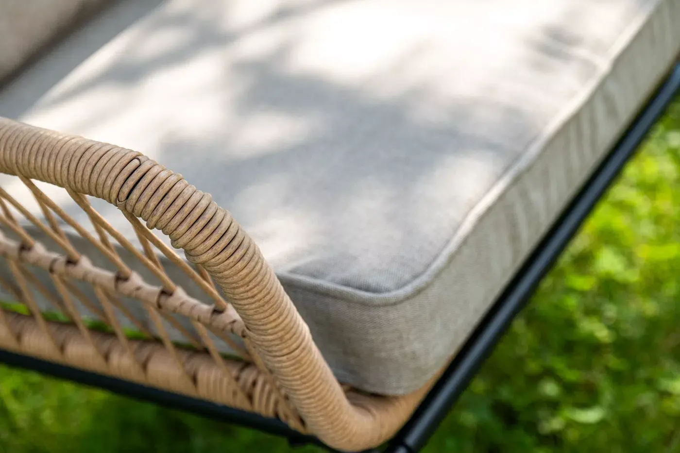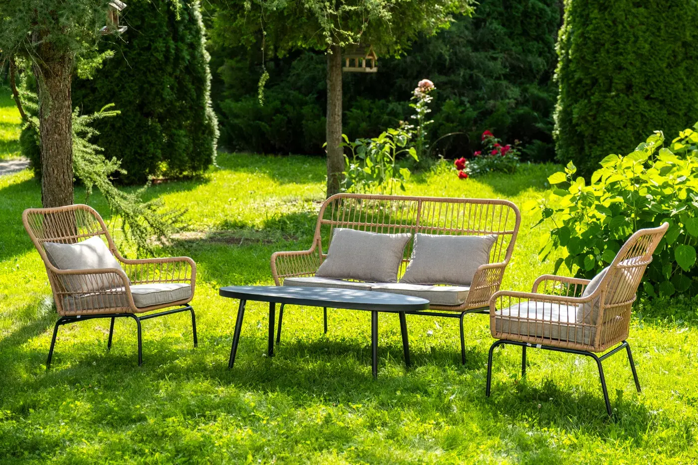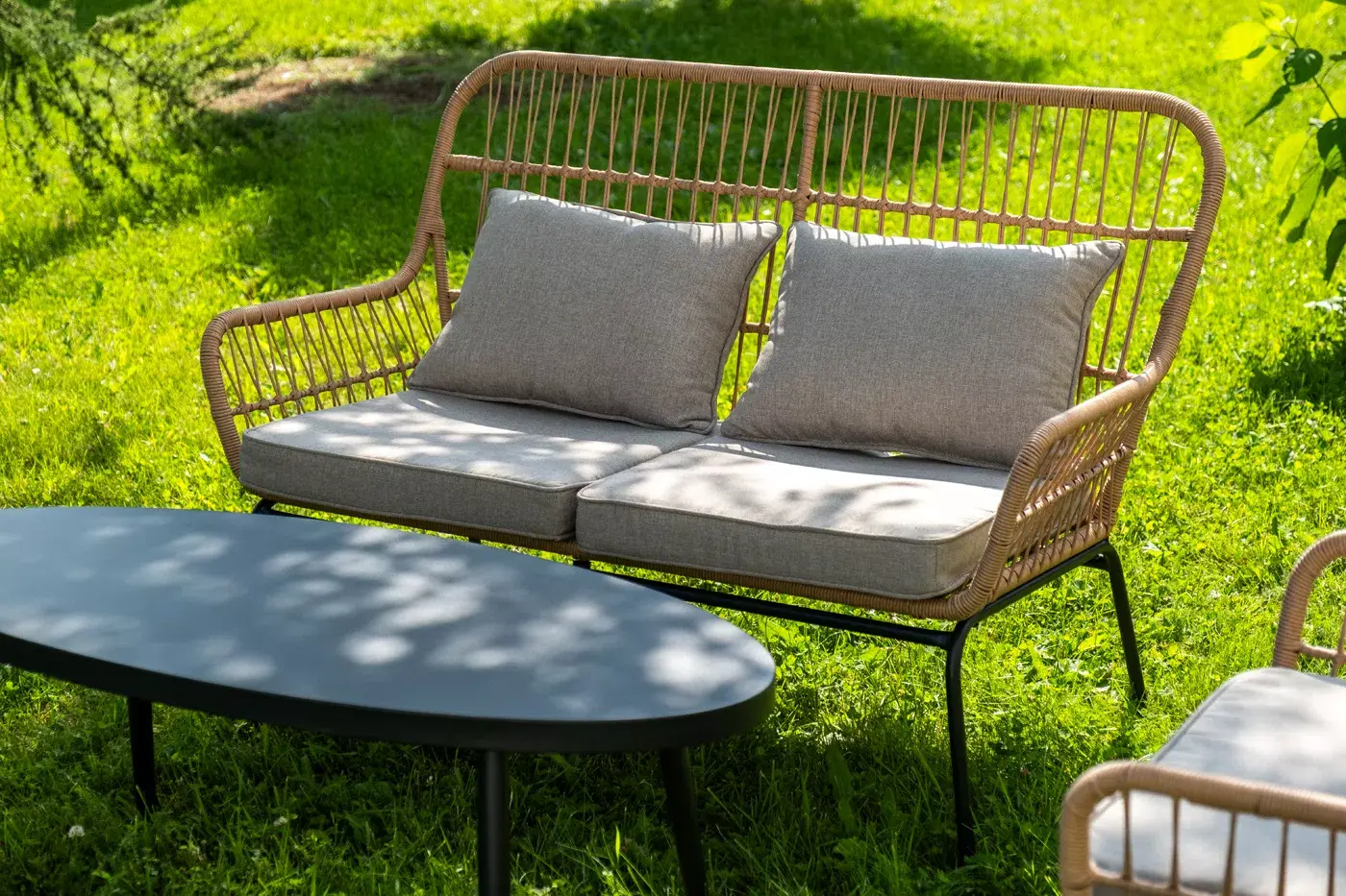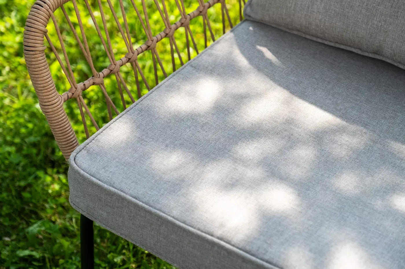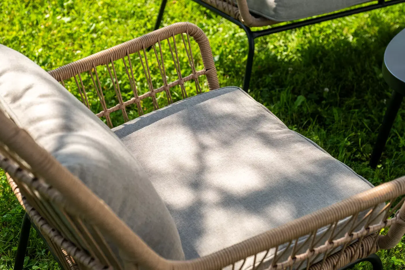 Оплетка выполнена вручную искусственным ротангом соломенного цвета, диван и кресла укомплектованы подушками из 100% полиэстера бежевого цвета.