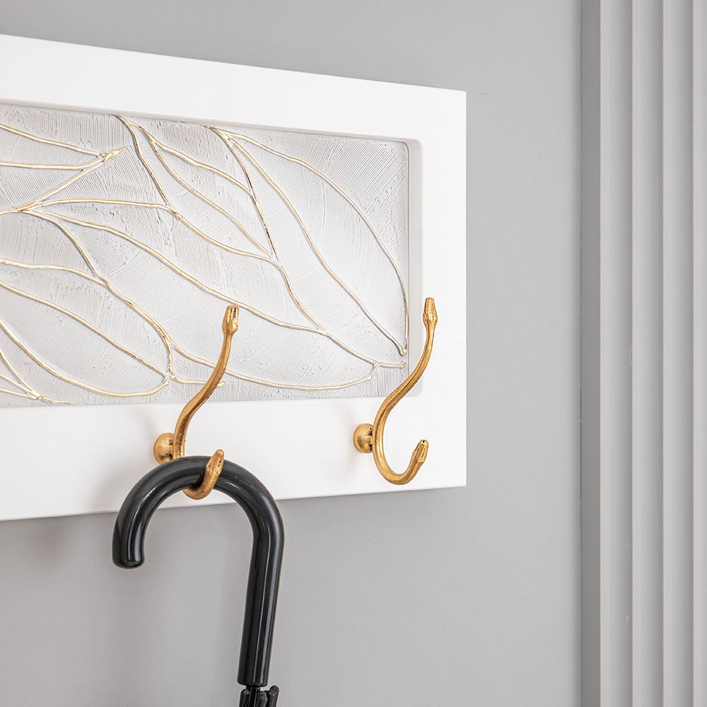 Основное назначение любой вешалки в прихожей - комфортно и компактно размещать верхнюю одежду и аксессуары. Прочный, надежный и износостойкий материал сохранит внешний вид изделия на долгие годы даже при постоянной эксплуатации. Кованые вешалки способны выдержать длительные нагрузки и большой вес тяжелой одежды. Компактность позволяет разместить предмет даже в самой малогабаритной прихожей. Настенный декор интерьера, панно на стену как кованая вешалка Монстера добавят уюта и шарма вашему дому, даче, офису, квартире. Оснащена полкой для головных уборов и шарфов. Вешалка кованая настенная Monstera Deliciosa выполнена полностью вручную методом горячей ковки, позолочена мастерами фабрики. Вешалка представлена в трех цветах: золото/серебро/бронза. В интерьере такой декор для дома выгодно оттенит любой современный стиль – лофт, скандинавский стиль, современный стиль. Гардеробная вешалка – стильное, оригинальное украшение для дома.