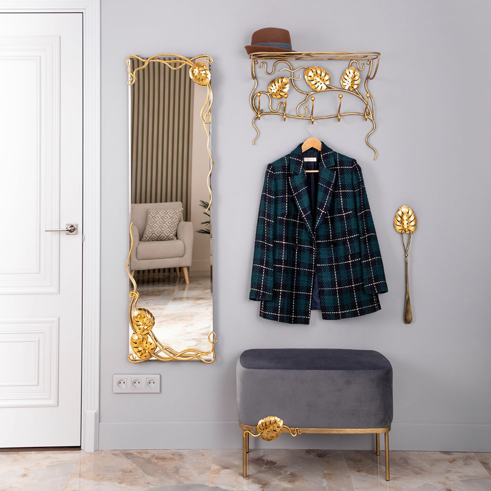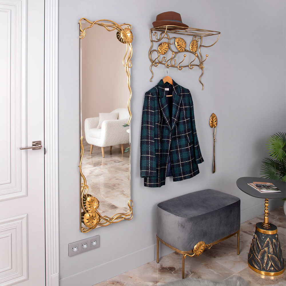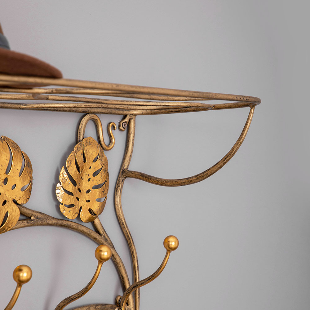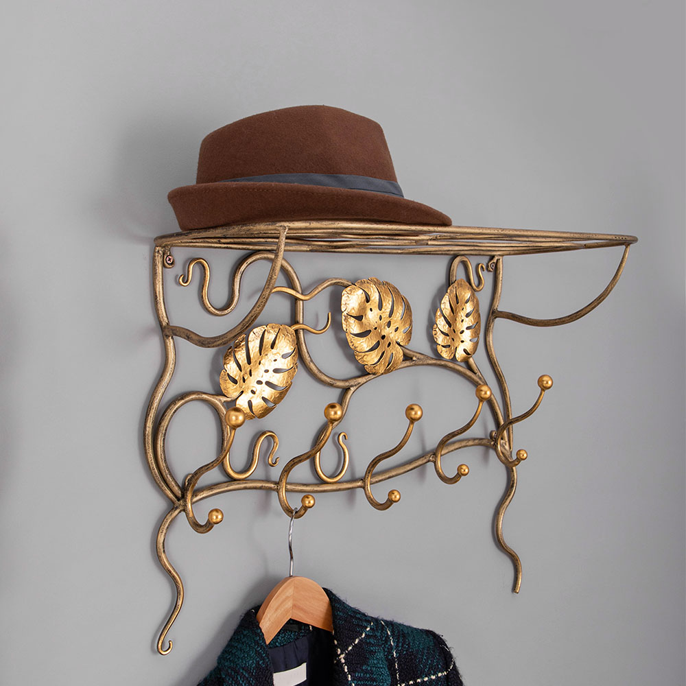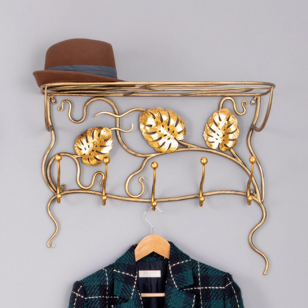 Основное назначение любой вешалки в прихожей - комфортно и компактно размещать верхнюю одежду и аксессуары. Прочный, надежный и износостойкий материал сохранит внешний вид изделия на долгие годы даже при постоянной эксплуатации. Кованые вешалки способны выдержать длительные нагрузки и большой вес тяжелой одежды. Компактность позволяет разместить предмет даже в самой малогабаритной прихожей. Настенный декор интерьера, панно на стену как кованая вешалка Монстера добавят уюта и шарма вашему дому, даче, офису, квартире. Оснащена полкой для головных уборов и шарфов. Вешалка кованая настенная Monstera Deliciosa выполнена полностью вручную методом горячей ковки, позолочена мастерами фабрики. Вешалка представлена в трех цветах: золото/серебро/бронза. В интерьере такой декор для дома выгодно оттенит любой современный стиль – лофт, скандинавский стиль, современный стиль. Металлическая гардеробная вешалка – стильное, оригинальное украшение для дома.