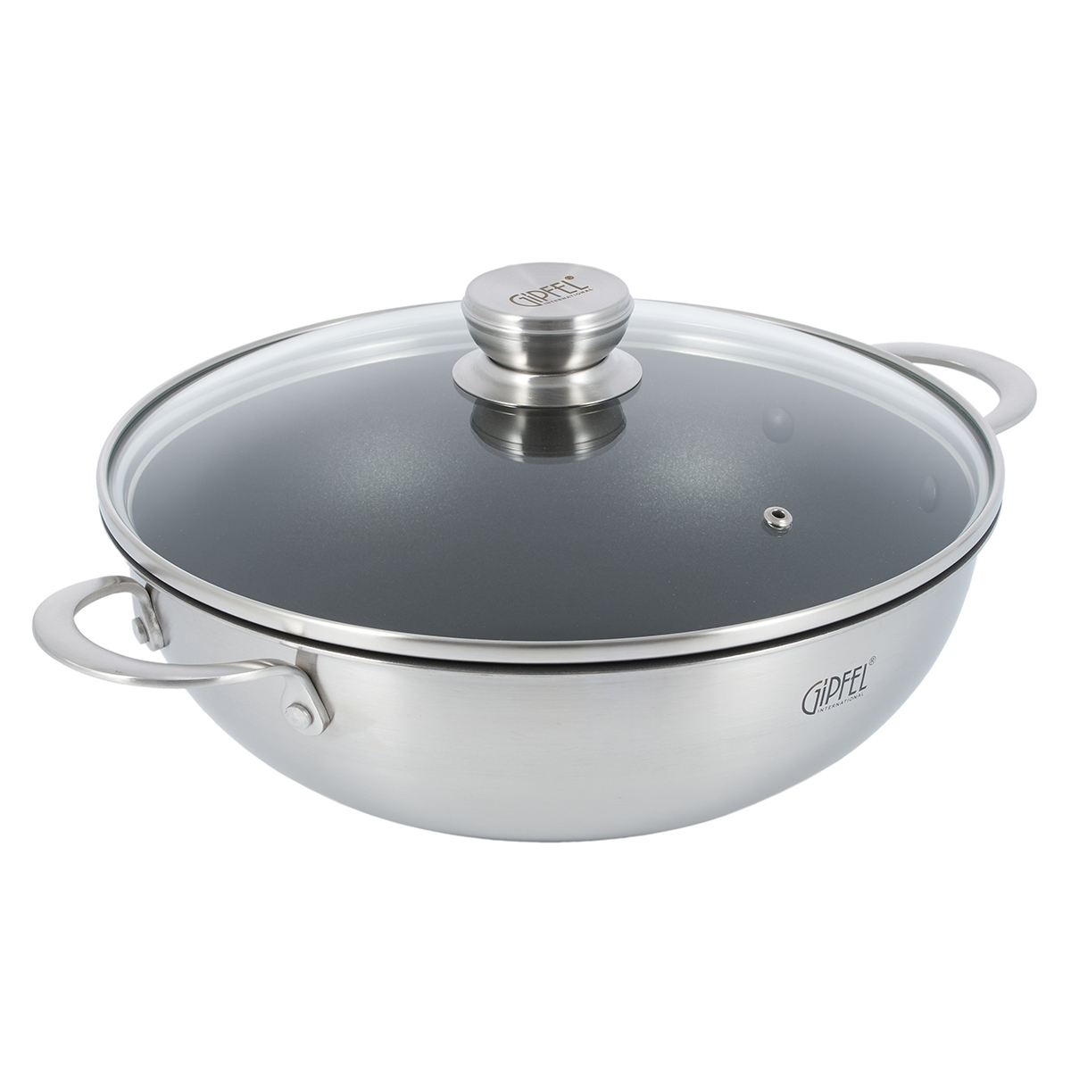 Вок из нержавеющей стали Gipfel Fusion 52188 28х9 см с антипригарным покрытием Ilag Durit Resist Pro и трехслойным капсульным дном. В комплекте крышка из закаленного стекла.