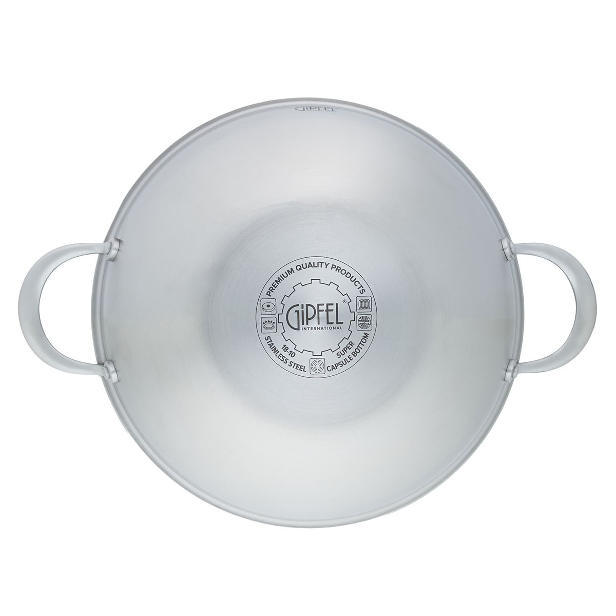 Вок из нержавеющей стали Gipfel Fusion 52188 диаметром 28 см и высотой стенок 9 см. Общий объем 4 л, полезный - 3 л.