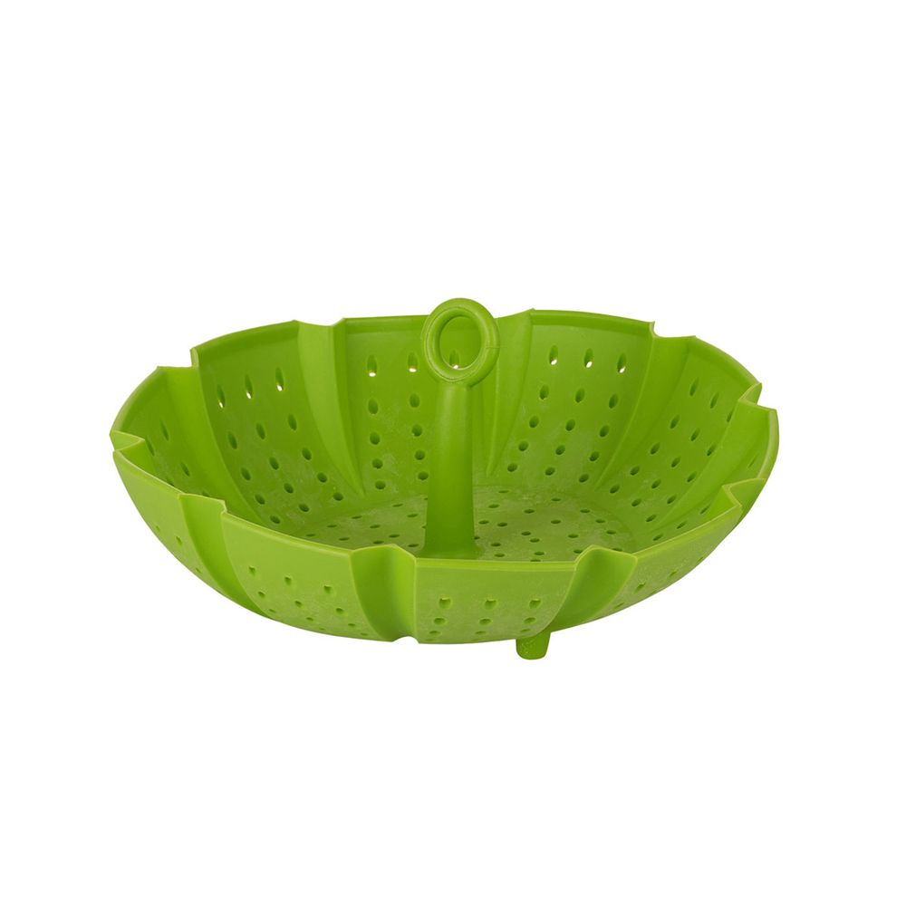 Подставка для варки на пару GIPFEL 1386. Подставка силиконовая на ножках диаметром 23см, диаметром дна 13см. Подставка выполнена из силикона, что позволяет не опасаться за антипригарное покрытие кастрюли, она не поцарапает внутренние стенки. Мягкий силикон позволяет готовить как в кастрюлях большего, так и в кастрюлях меньшего диаметра. Материал: силикон, пластик. Цвет: зеленый.