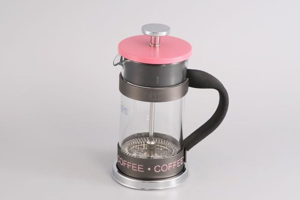 Стеклянный заварочный чайник с поршнем Gipfel GLACIER - GENEVA 7593. Объем чайника 350 мл. У чайника розовая крышка и черная пластиковая ручка. Фильтр и сетка из нержавеющей стали.