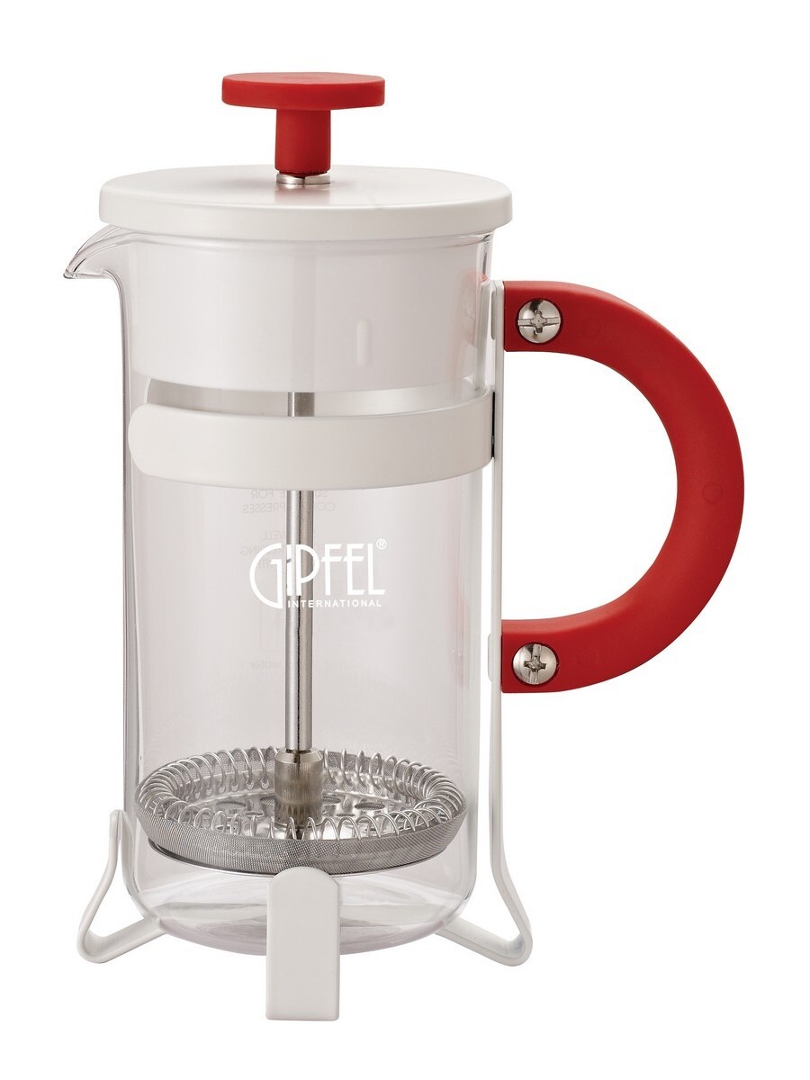 7052 GIPFEL Стеклянный заварочный чайник MILEBI 12,5х7,7х16,7см. 350 мл с поршнем белый с красной ручкой Материал: Боросиликатное стекло, кремний, S/S 18/10 (#304)