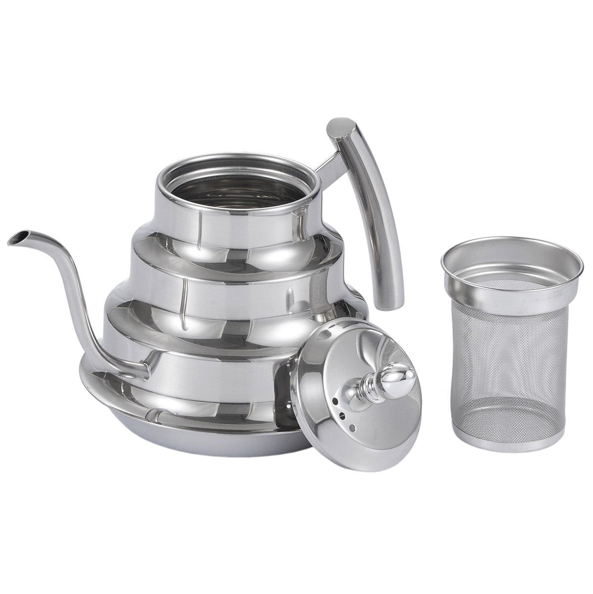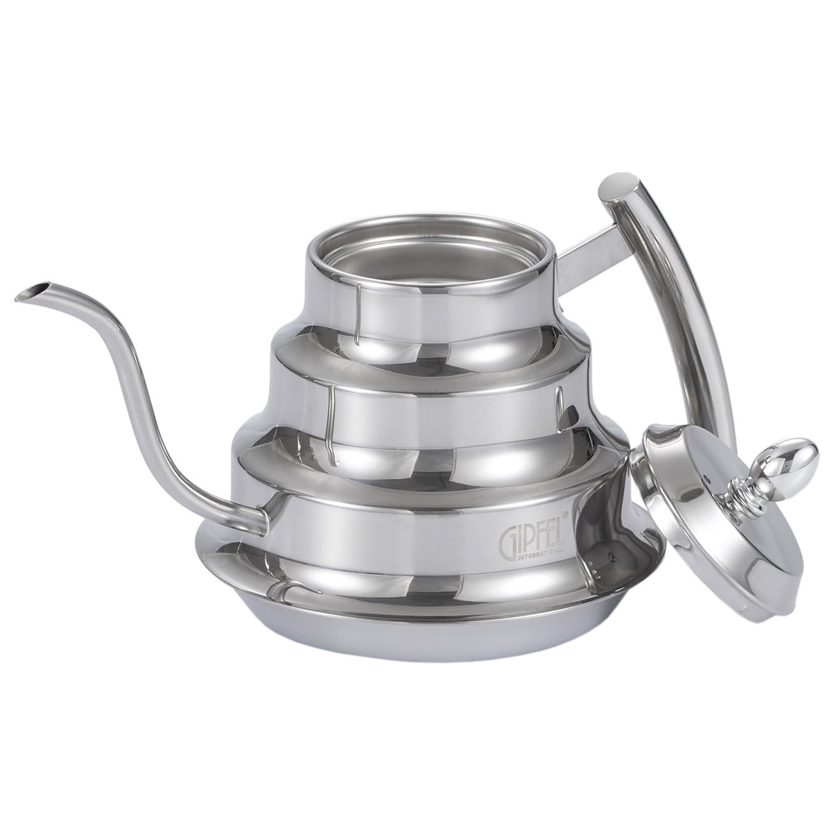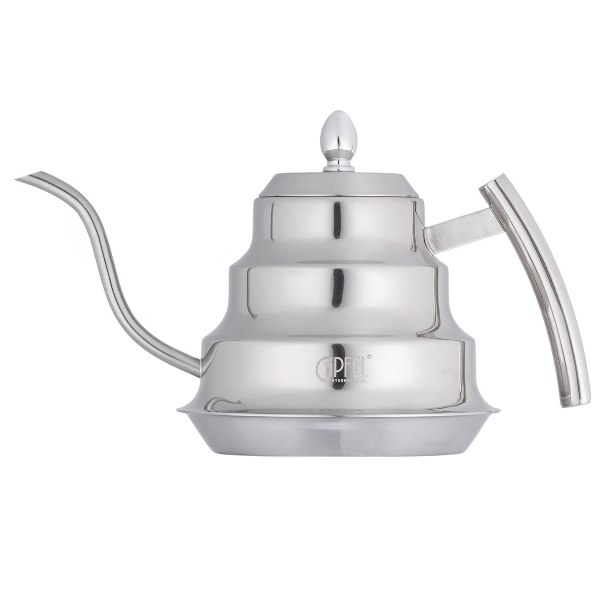 Чайник заварочный Gipfel Orient 51887 с длинным носиком и фильтром-сеткой. Объем 1200 мл. Размер 300х120х170 мм. Чайник сделан из нержавеющей стали и имеет красивую глянцевую поверхность.