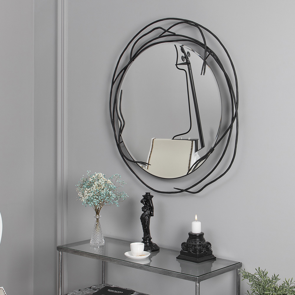 Дизайнерское настенное зеркало Art подходит для выразительных интерьеров в современном стиле. Такой декор отражает не только образы на зеркальном полотне, но и характер всего дома.Это интерьерное зеркало выглядит самодостаточно и броско, и может использоваться по прямому назначению: например, как гримерное в комбинации с мебелью (туалетный столик с зеркалом). А может использоваться как настенная декорация для прихожей, гостиной, коридора, спальни. Ведь такое зеркальное панно на стену, украшенное ковкой, смотрится эстетично и дорого в любом пространстве.
