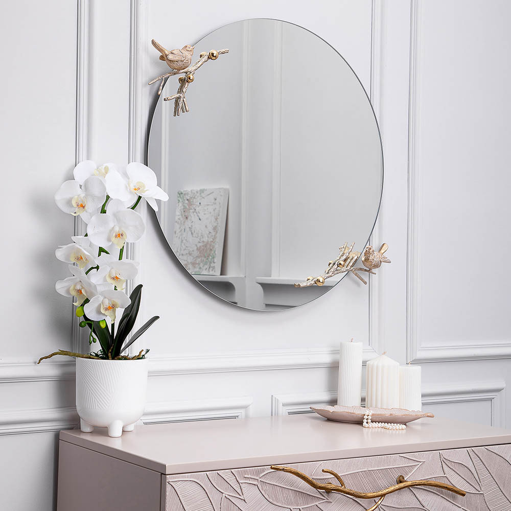 Зеркало «Терра» выглядит лаконично, элегантно и праздничноНа декоративных ветвях из кованой стали расположились маленькие птички, они словно только что вернулись из тёплого края и приветствуют весну, напевая свои звонкие мелодии. Это зеркало – тонкая и аккуратная ручная работа, в которую мастера фабрики BOGACHO действительно вложили душу.