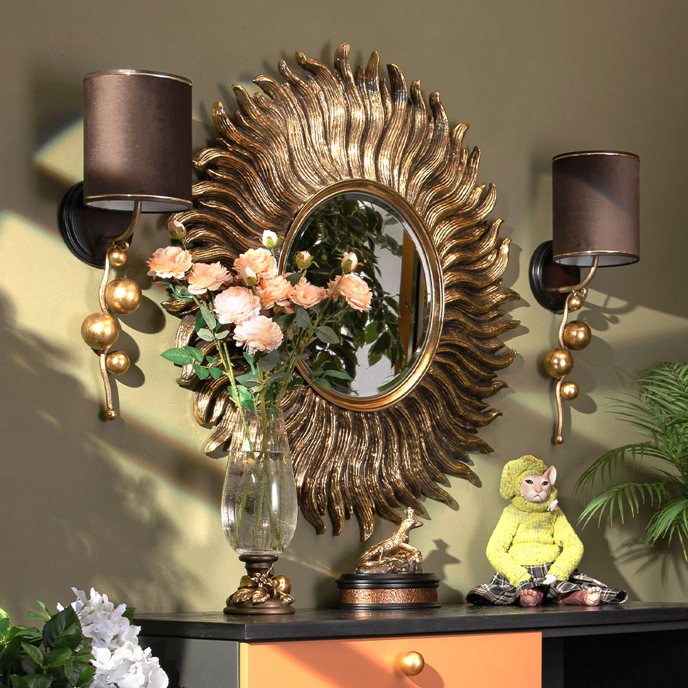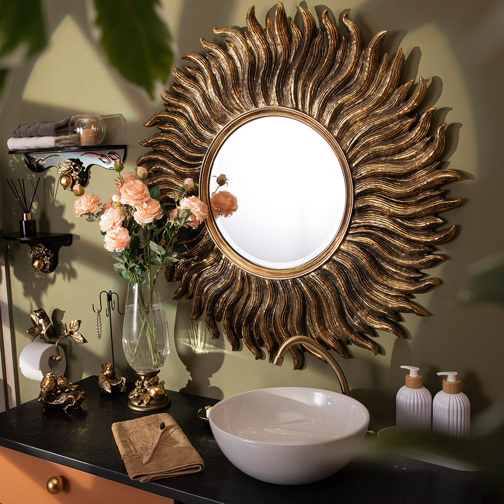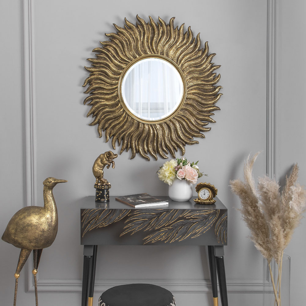 Пусть всегда будет солнце!Хорошо, когда светит солнце! Его лучи воодушевляют и заставляют радоваться жизни. Отлично иметь собственное солнце в интерьере! Оно тоже может стать источником хорошего настроения, вдохновения, особенно, если оно такое красивое и необычное, как это зеркало. Оригинальное дизайнерское решение, стильный, притягательный и невероятно атмосферный предмет мебели. Зеркало «Солнце» будто сошло со страниц произведений Александра Пушкина или пришло к нам из народных сказок. Впрочем, каждый может найти свой собственный смысл, свое определение, ведь это зеркало является частью одной из самых удивительных коллекций BOGACHO!